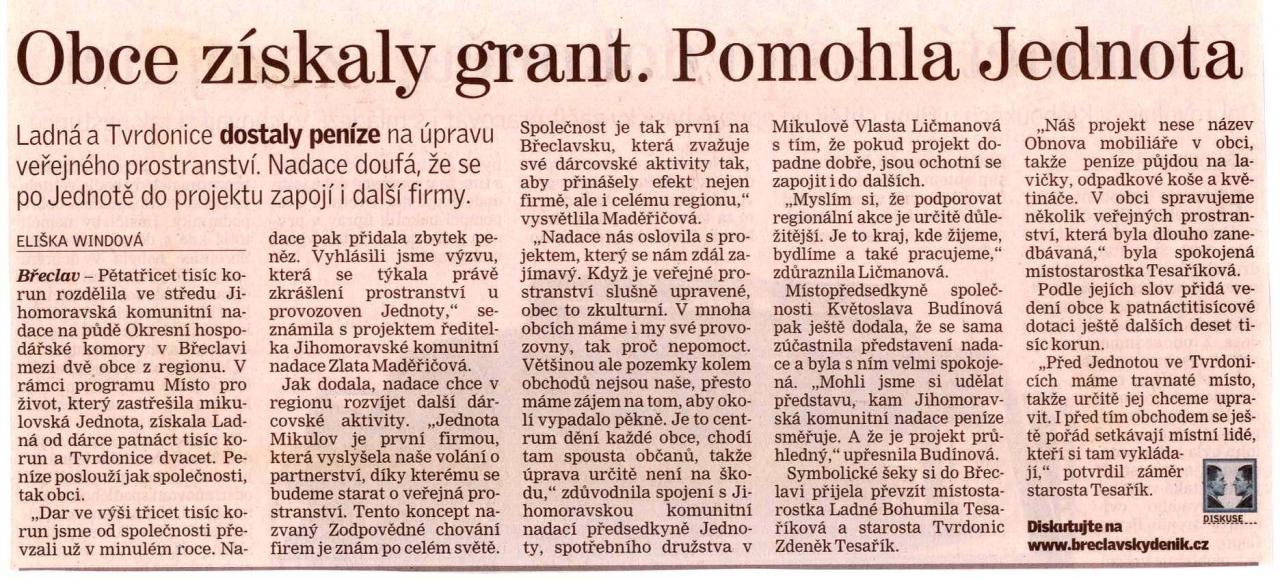Obce získaly grant. Pomohla Jednota