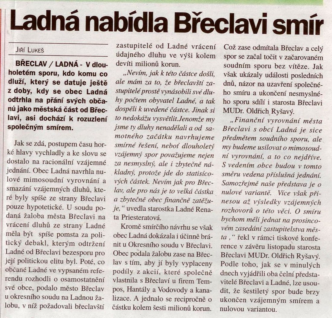 Ladná nabídla Břeclavi smír