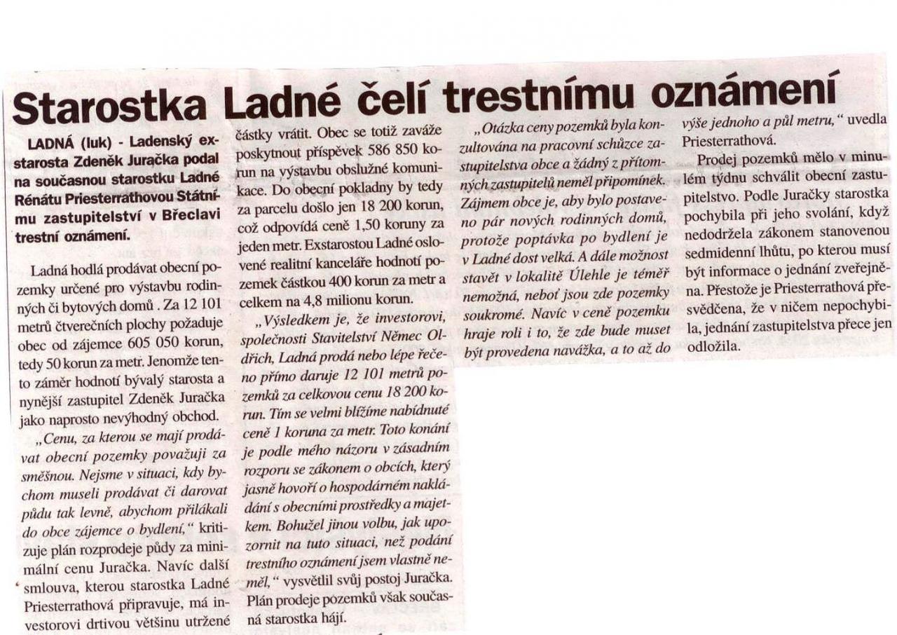 Starostka Ladné čelí trestnímu oznámení